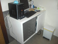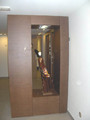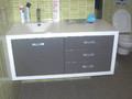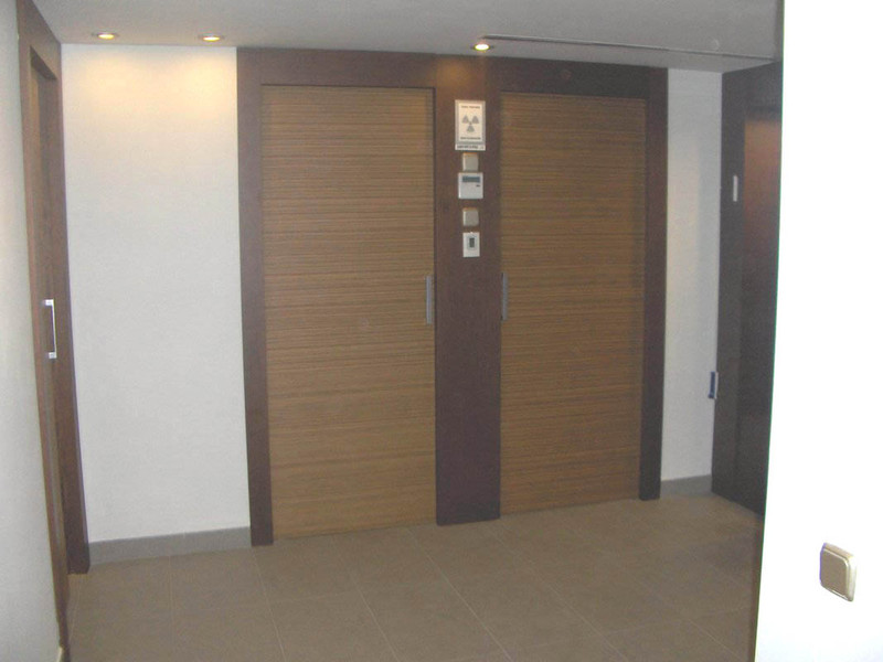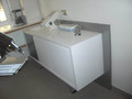Gabinetes para clínica dental, encimeras y lavabos en LG Hi-Macs alpine white. Puertas y cajones en acero. Mostrador recepción combinado en cristal lacado y madera lacada.