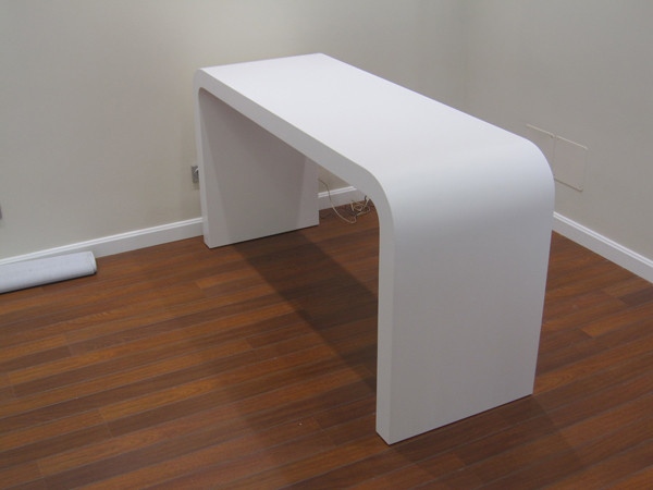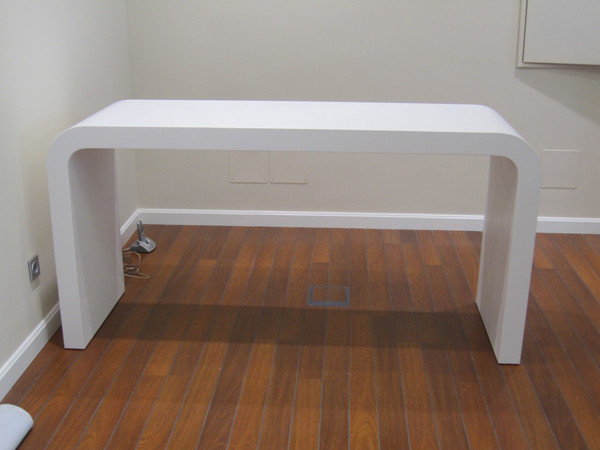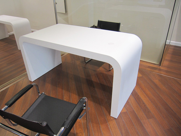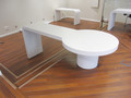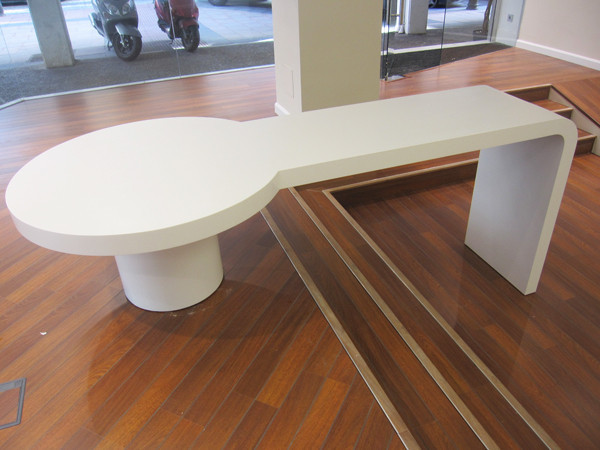 Mesas de recepción y trabajo curvadas íntegramente fabricadas en LG Hi-Macs® color alpine white.